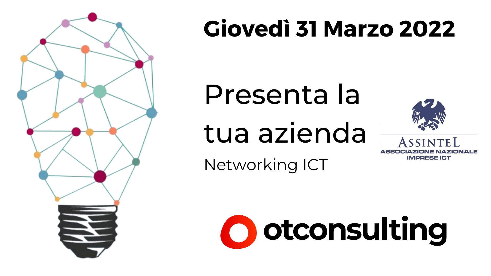 Grazie all'invito di Assintel, l'associazione nazionale delle imprese ICT, OT Consulting avrà l’occasione di raccontarsi, partecipando ad un evento online giovedì 31 marzo 2022 alle 14:30. Parlerà della propria expertise e di ciò che la rende l'alleato ideale delle aziende per aggiungere valore ai processi di business durante il percorso di Digital Transformation.