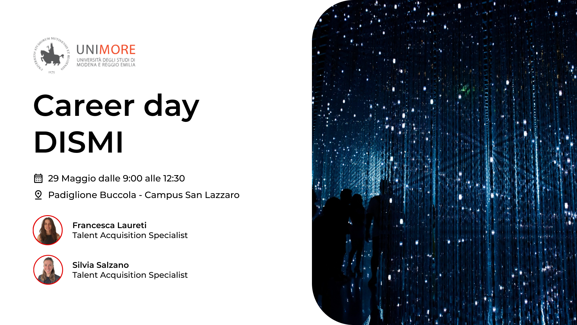 Il 29 Maggio, dalle 9:00 alle 12:30, saremo presenti al Dipartimento di Scienze e Metodi dell'Ingegneria di UNIMORE, presso il Padiglione Buccola del Campus San Lazzaro, stand 5, insieme a Francesca Laureti e Silvia Salzano. Saranno a disposizione per fornirti tutte le informazioni di cui hai bisogno e dissipare ogni dubbio. Potrai ottenere dettagli sul mondo dell'ICT e capire il funzionamento di una società di consulenza per la Digital Transformation.